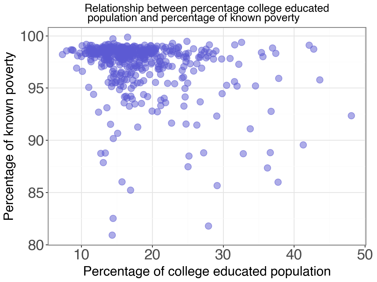 labs(title="Relationship between percentage college educated\n population and percentage of known poverty", x="Percentage of college educated population", y="Percentage of known poverty")
