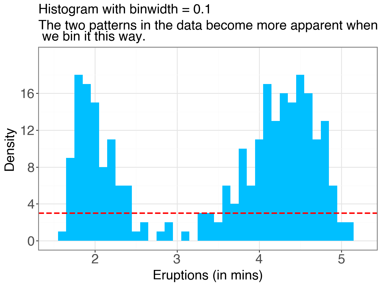 labs(title="Histogram with binwidth = 0.1",subtitle="The two patterns in the data become more apparent when\n we bin it this way.") +