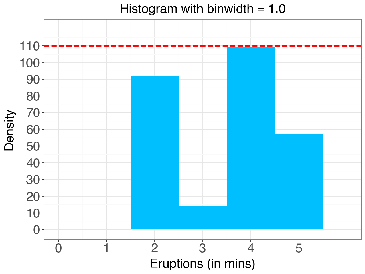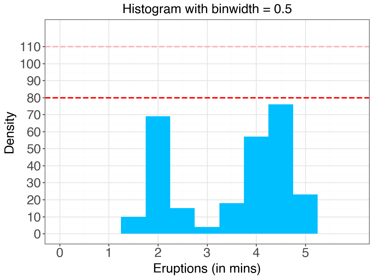 scale_x_continuous(name="Eruptions (in mins)", breaks = range(0, 6, 1), limits=[1.5, 5.25]) +