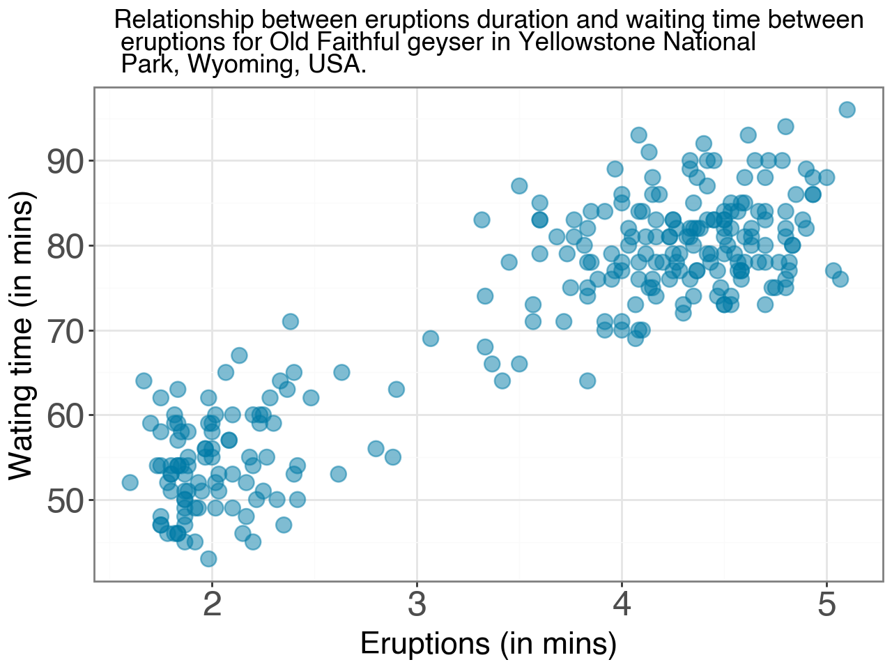 labs(title="Relationship between eruptions duration and waiting time between\n eruptions for Old Faithful geyser in Yellowstone National\n Park, Wyoming, USA.", x="Eruptions (in mins)", y="Wating time (in mins)")