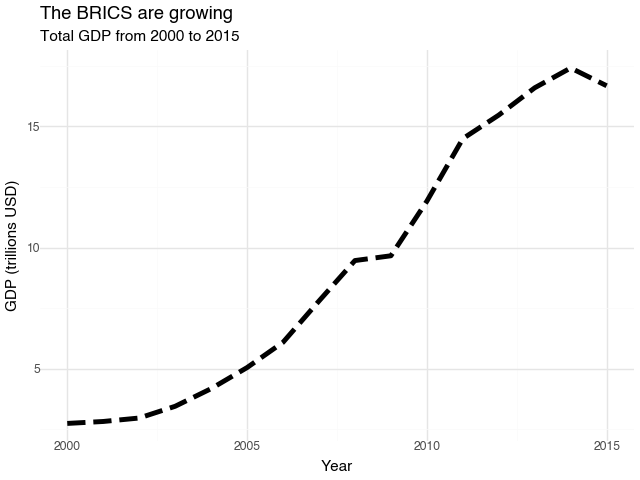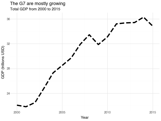 ggplot()+ geom_line(total_gdp_g7, aes("year", "gdp"), size = 2, linetype = "dashed")
