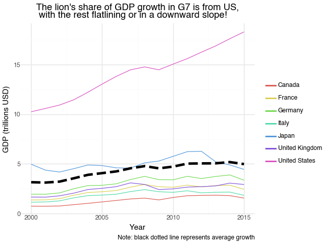 = "The lion's share of GDP growth in G7 is from US,\n with the rest flatlining or in a downward slope!",