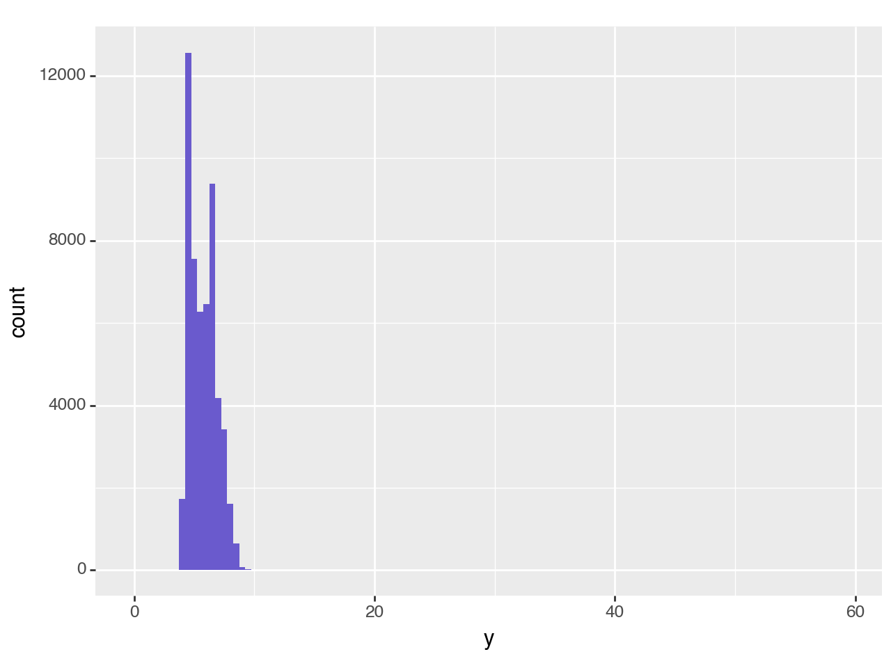 y variable, the only indication of possible outliers is an unusually wide x-axis.y variable, we get to see the outlier values in the distribution (0, ~30, and ~60)| x | y | z | price | |