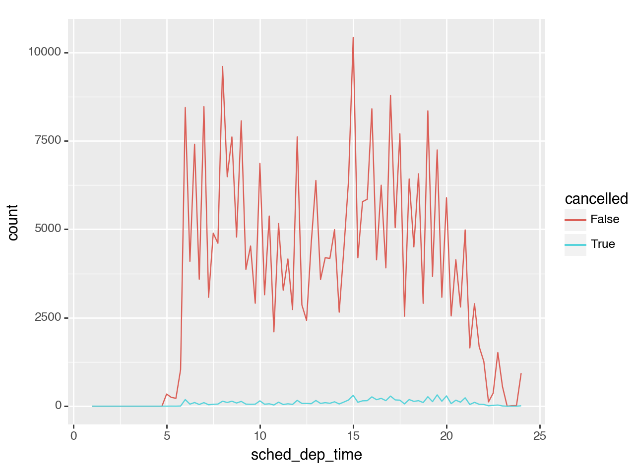 + geom_freqpoly(aes(color="cancelled"), binwidth=1 / 4)Not exactly the best plot given that there are many more flights that were not cancelled than flights were (thankfully)!