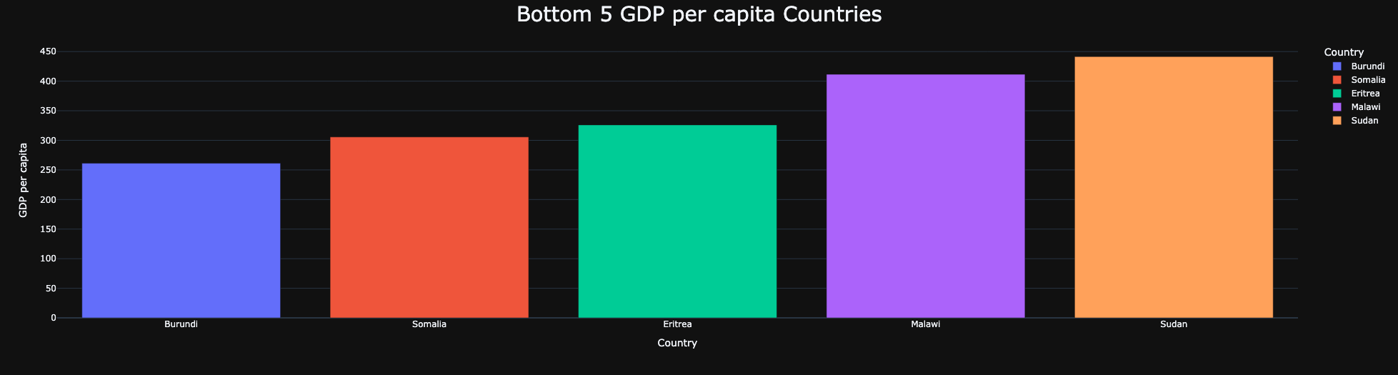 bottom_5_gdppercapita_country_countries= gdppercapita_country.sort_values(by='GDP per capita',ascending=True)