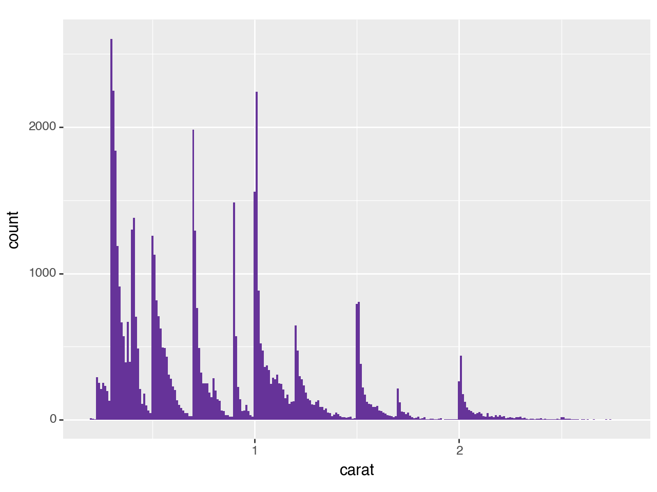 (ggplot(smaller_diamonds, aes(x="carat")) + geom_histogram(binwidth=0.01,fill='rebeccapurple'))This histogram suggests some interesting questions: