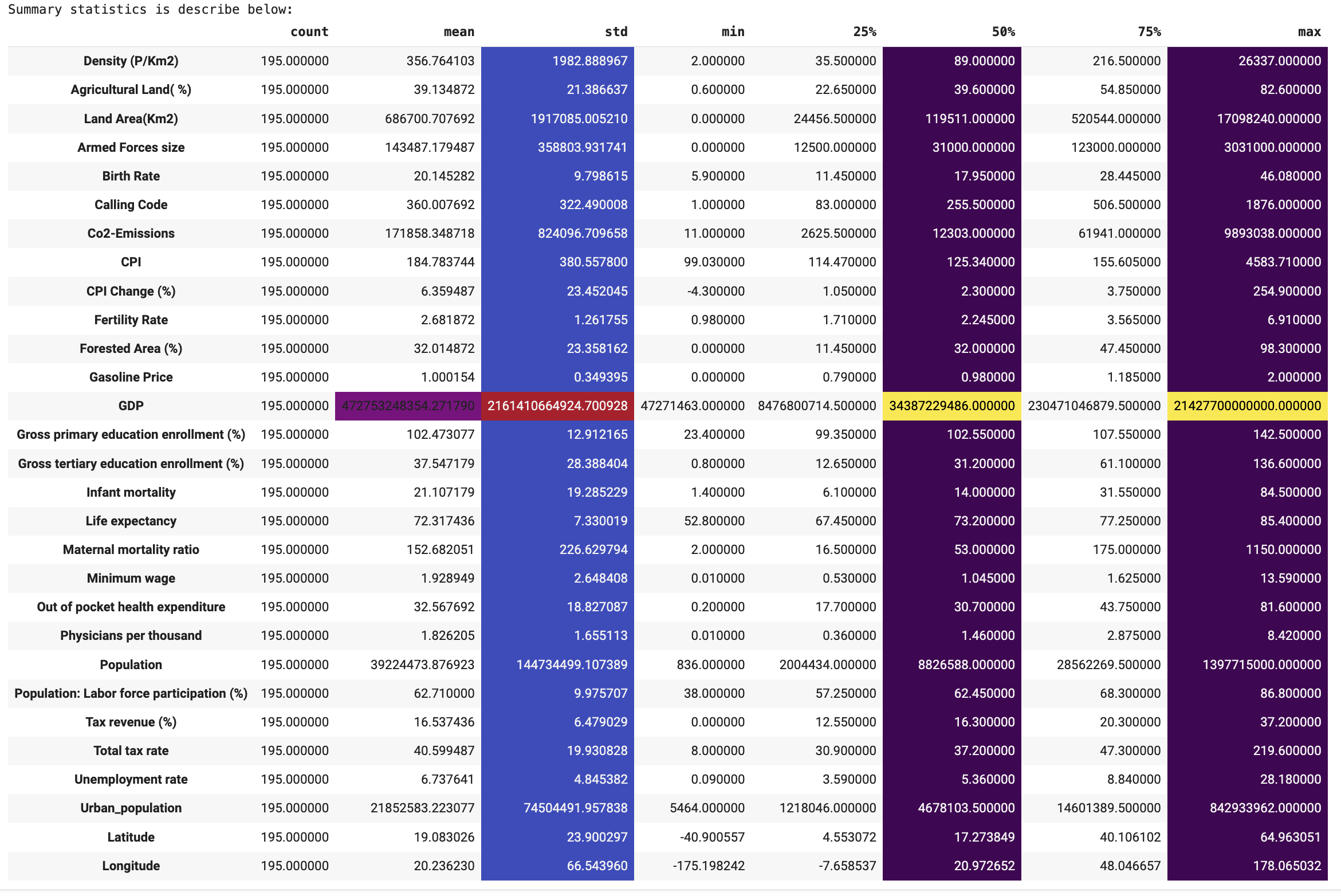 ).background_gradient(subset=['std'],cmap=plt.cm.coolwarm).background_gradient(subset='50%',cmap='viridis').background_gradient(subset='max',cmap='viridis')We create a column “GDP per capita” (GDP divided by Population)