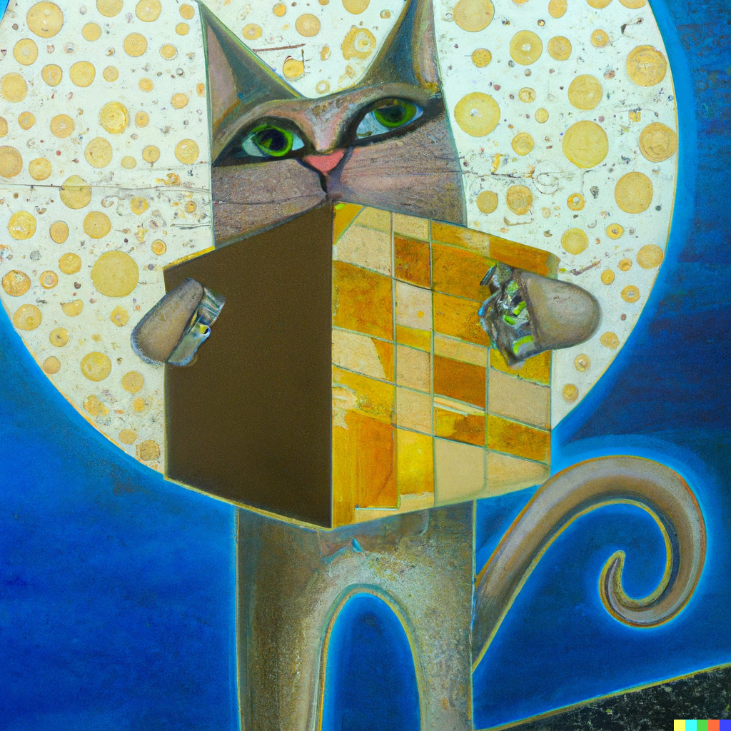“A cat on the moon holding a box with the source of true wisdom and happiness; cubism style”