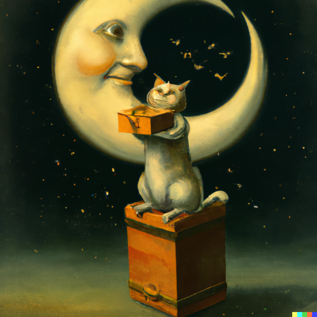 “A silly cat on the moon holding a box with the source of true wisdom and happiness; Dutch realist painting style”