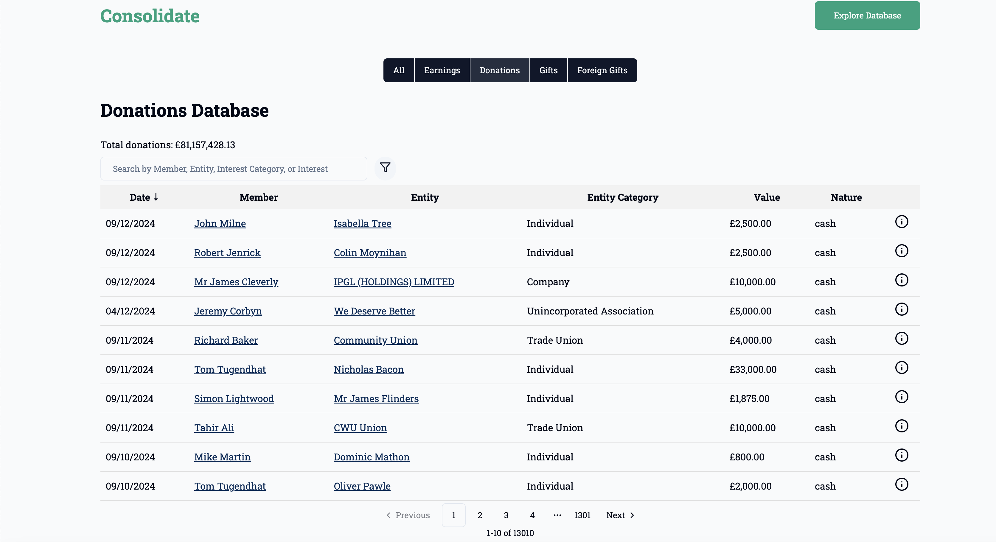 | Date | Member | Entity | Entity Category | Value (in £) | Nature |