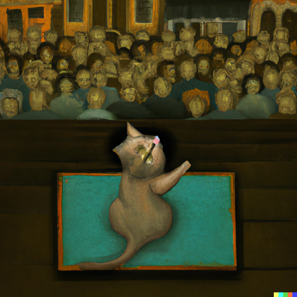 ^Image generated with DALL-E 2 with prompt βAn orator cat preaching to the crowd in the style of Van Goghβ