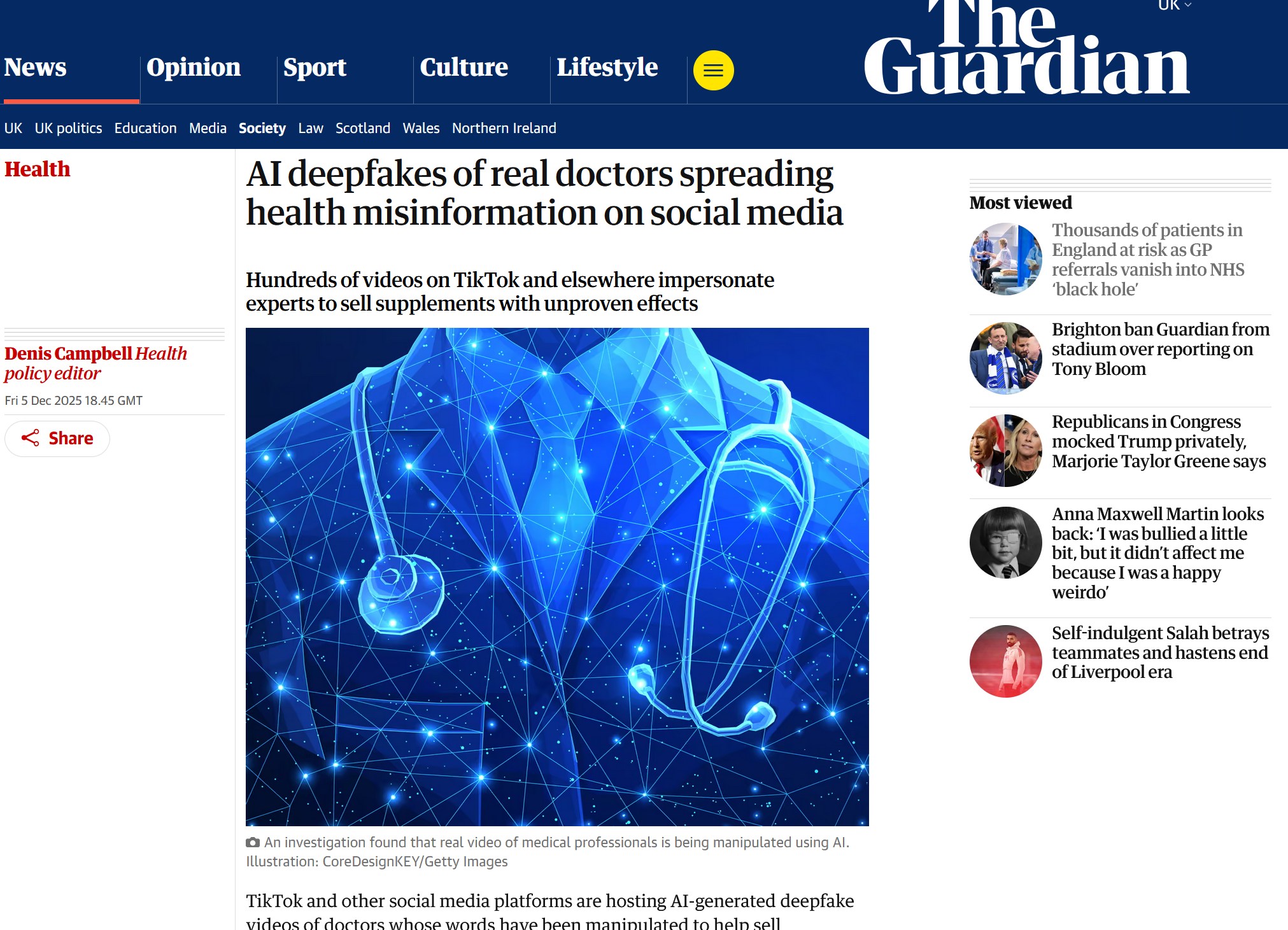 https://www.theguardian.com/society/2025/dec/05/ai-deepfakes-of-real-doctors-spreading-health-misinformation-on-social-media.