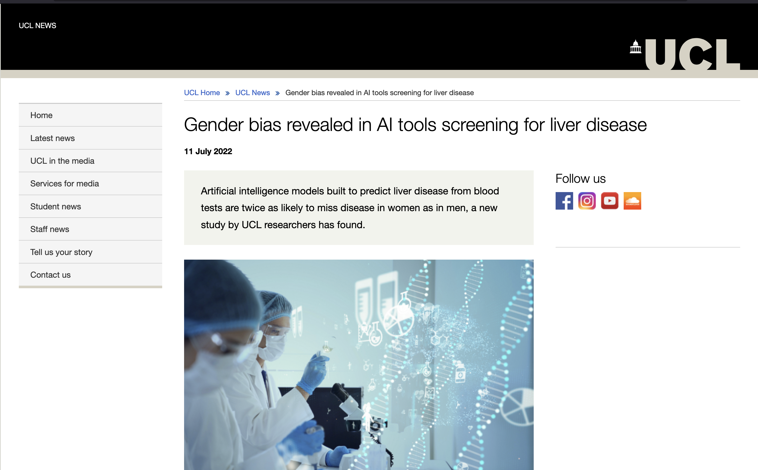 “Gender Bias Revealed in AI Tools Screening for Liver Disease. UCL News.” July 11, 2022.