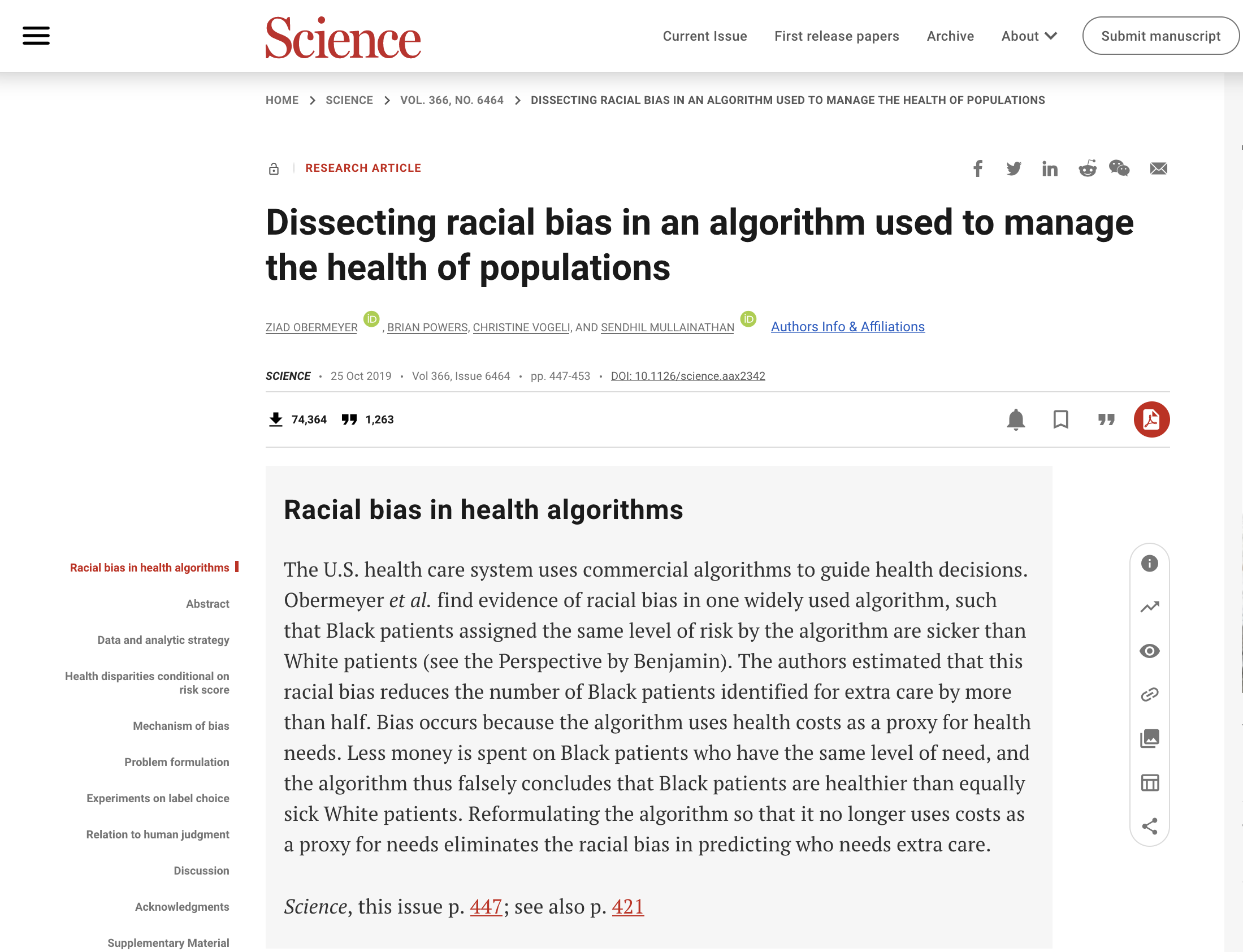 “Dissecting Racial Bias in an Algorithm Used to Manage the Health of Populations.” Science 366 (6464): 447–53.