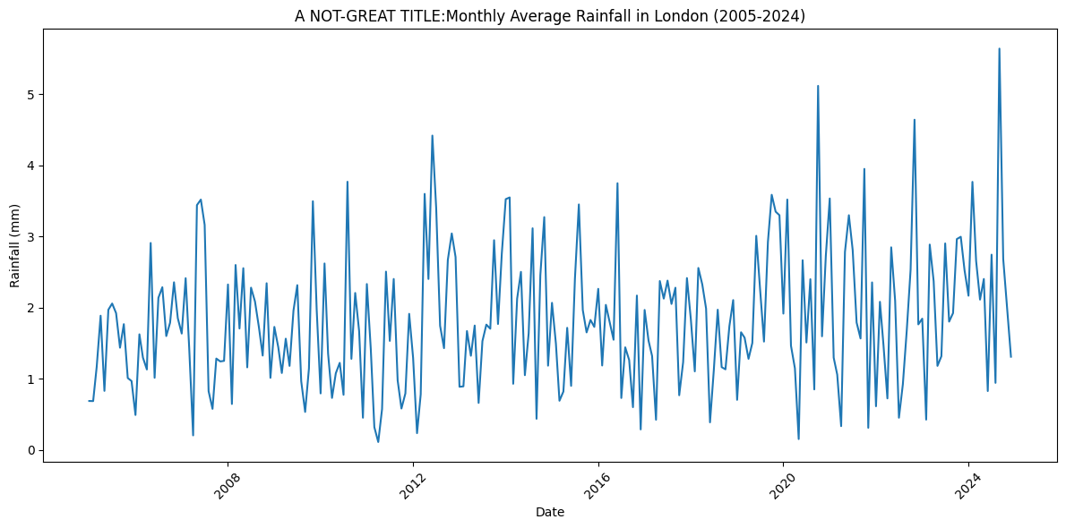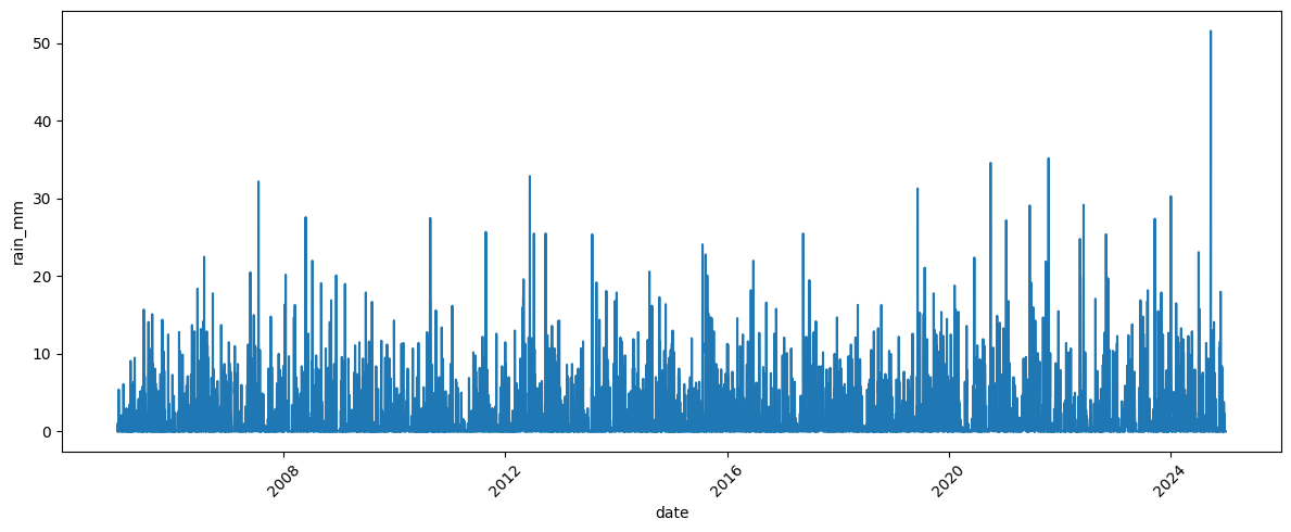 Provided you have a DataFrame plot_df which contains the columns date and rain_mm, this is the line that would produce a simple line plot: