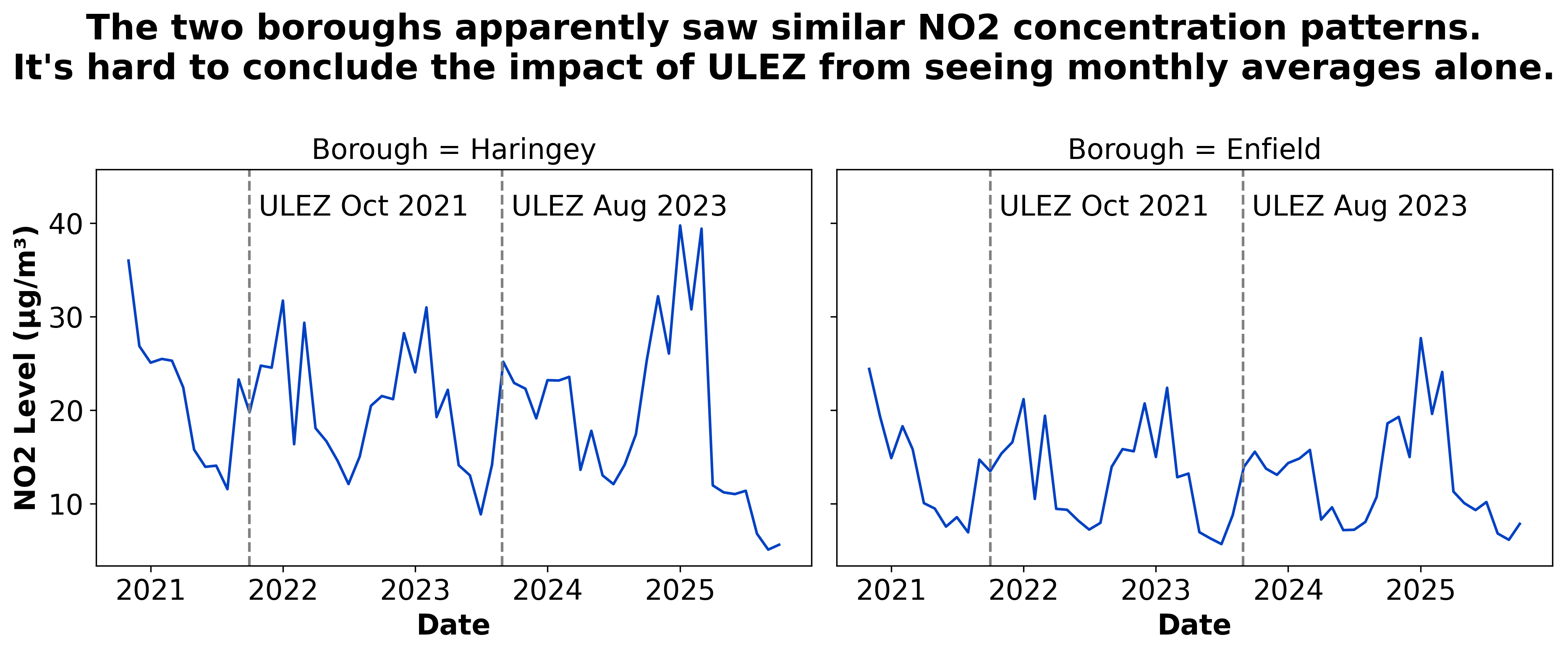 Aden Grandcourt, one of your classmates, framed his project as a comparison of the impact of ULEZ on air quality (\(NO_2\) concentration) in two neighbouring boroughs: