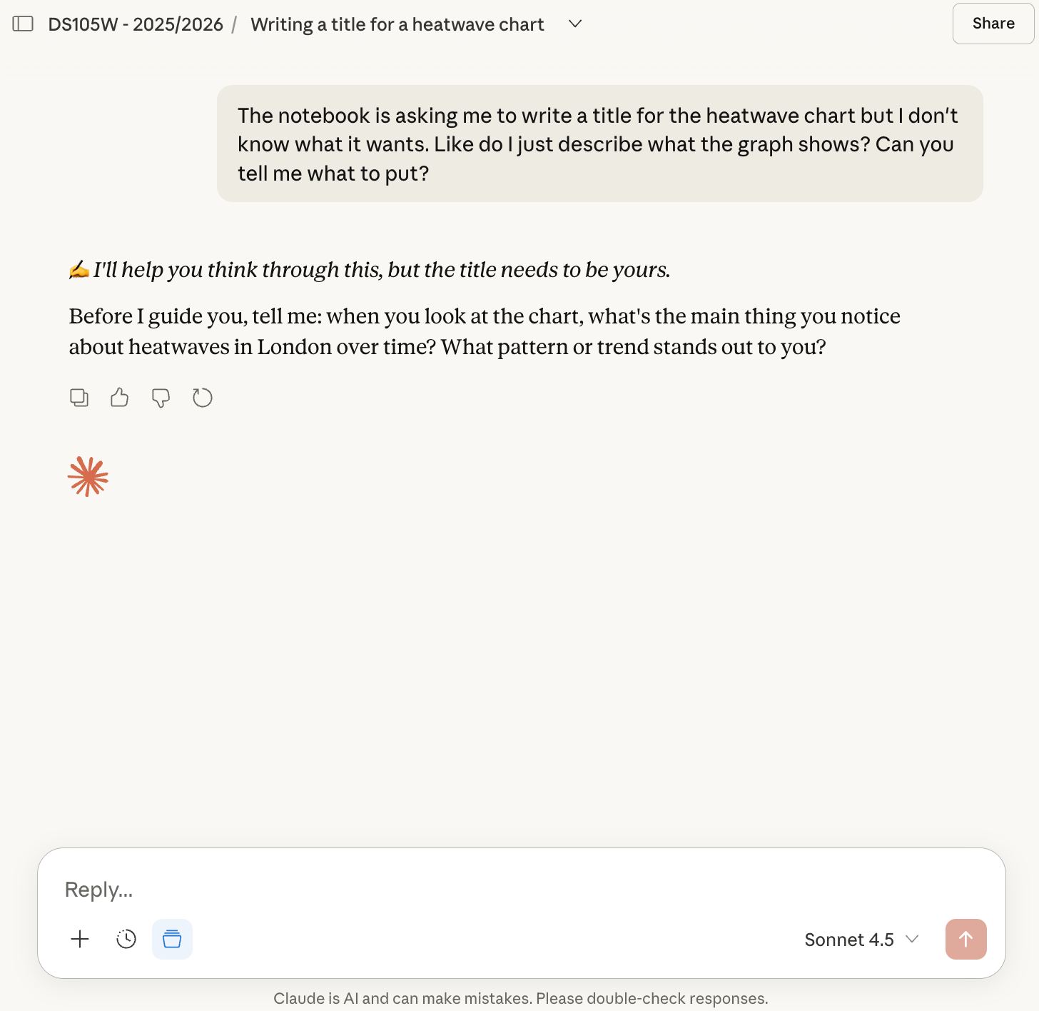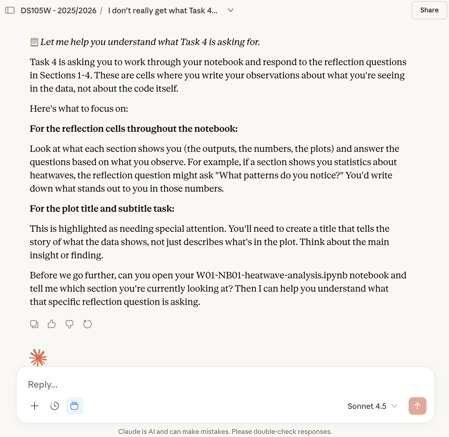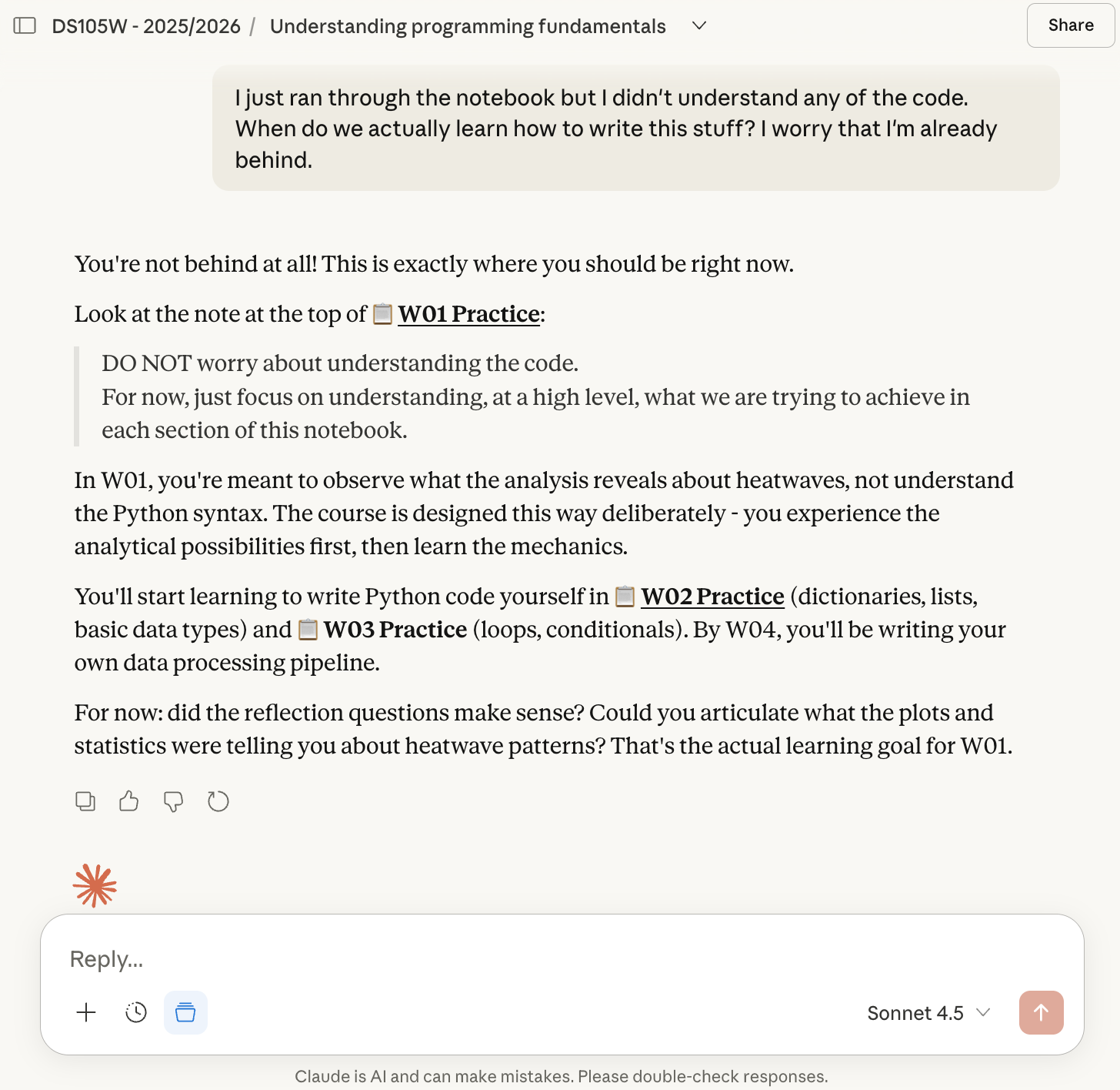 The DS105 Claude tutor knows our course. It has the context of the materials you have access to: the Practice pages, the Lab notebooks, the skills we’re building each week. When you ask a question, it understands the context you’re working in and adjusts its responses accordingly.