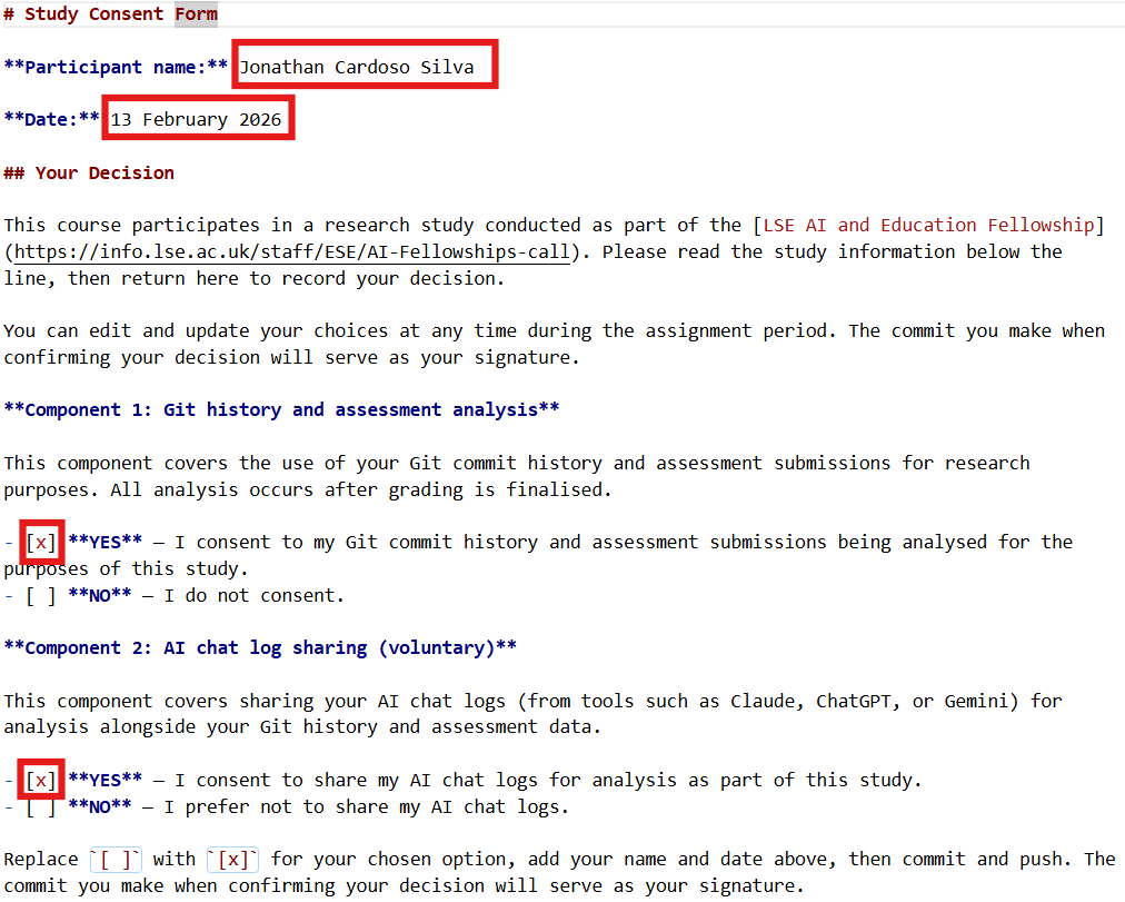 What to do: Open it in VS Code, read the “About the Study” section, fill in your name and date, and replace [ ] with [x] next to your chosen option for each component. We truly appreciate your participation in the study, even if you don’t use AI at all! But of course, both YES and NO are valid choices.