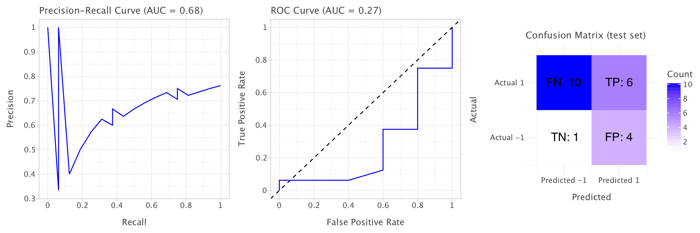 Comparing the training metrics to the test set metrics, it’s clear that the model performs significantly better on the training set. On the test set, precision drops to 0.7, recall drops to 0.4375, and F1-score drops to 0.538. This suggests that the model might be overfitting on the training data, capturing patterns that don’t generalize well to unseen data. The AUC-ROC on the test set is 0.281, which is very low, suggesting that the model is not discriminating well between the positive and negative classes on the test set. Similarly, the AUC-PR on the test set (0.687) is also lower than on the training set, though it’s better than AUC-ROC.