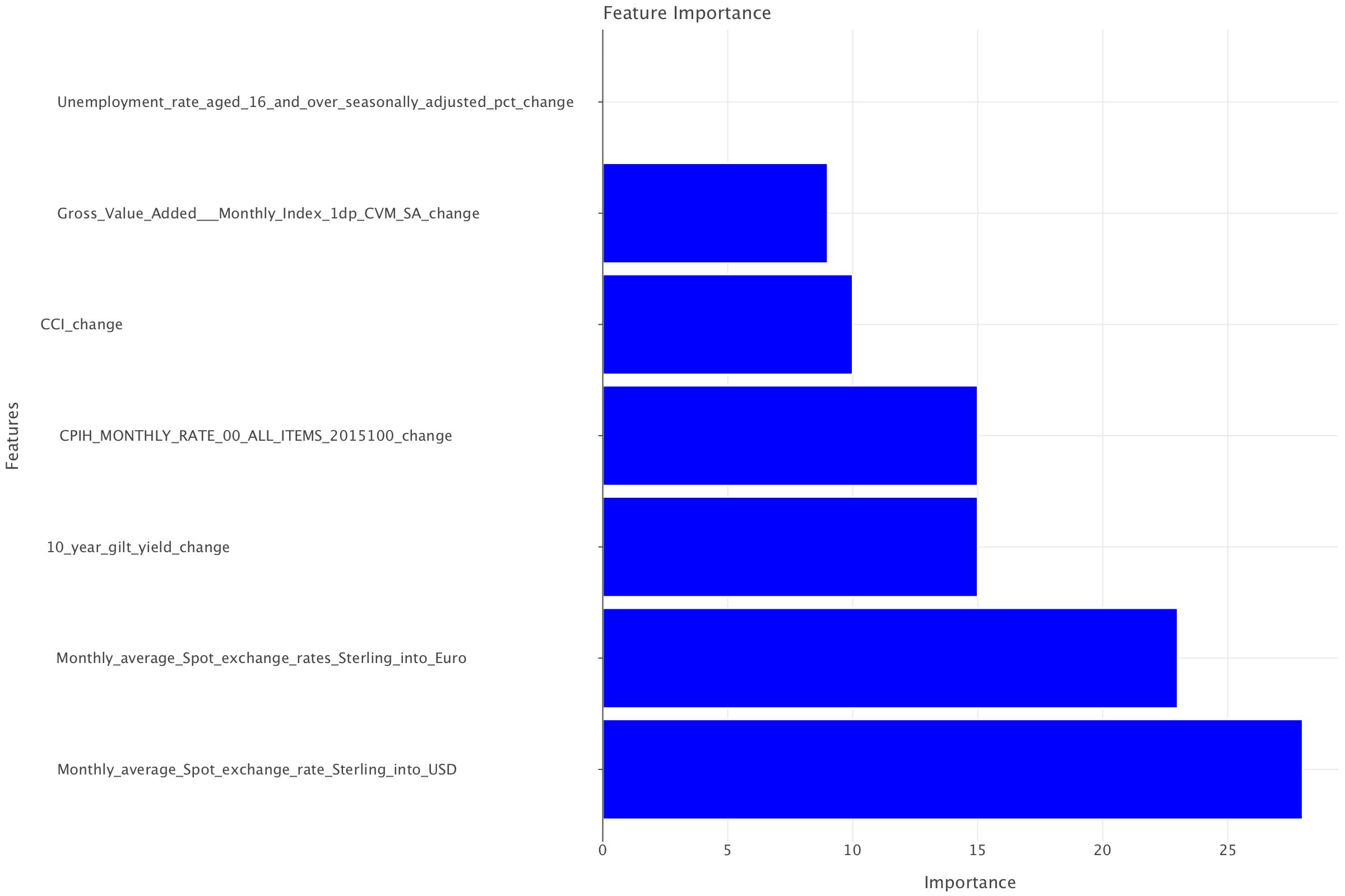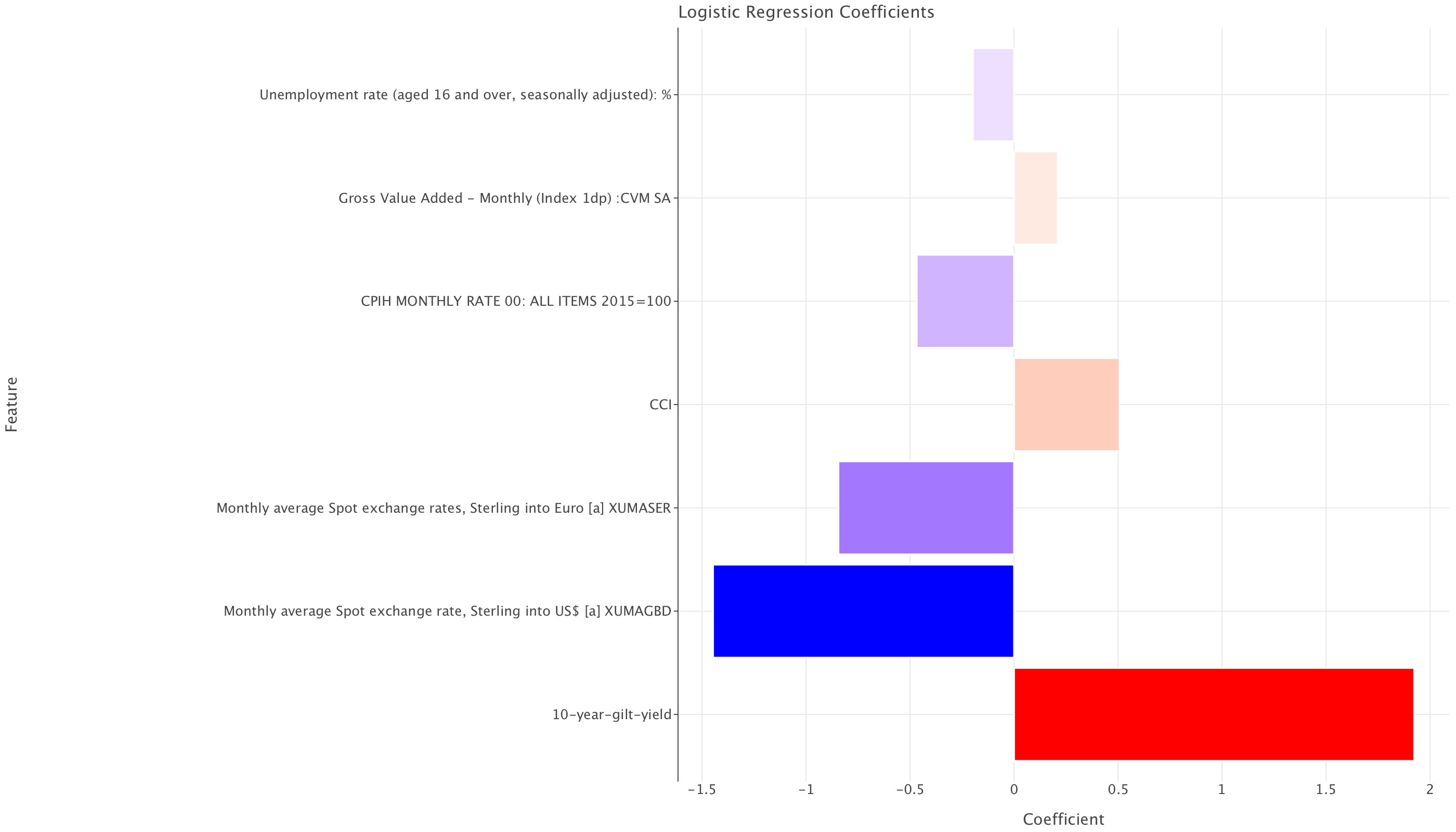 Logistic regression highlighted gilts earlier and still had exchange rates as important but as less imprtant than gilts. For LightGBM, exchange rates take precedence (in the same ordering as for logistic regression, the sterling to USD exchange rate appearing to be slightly more significant than the sterling to Euro rate) before gilt yields. But it is still remarkable that both models highlight the same features in the top 3 albeit in slightly different ordering.