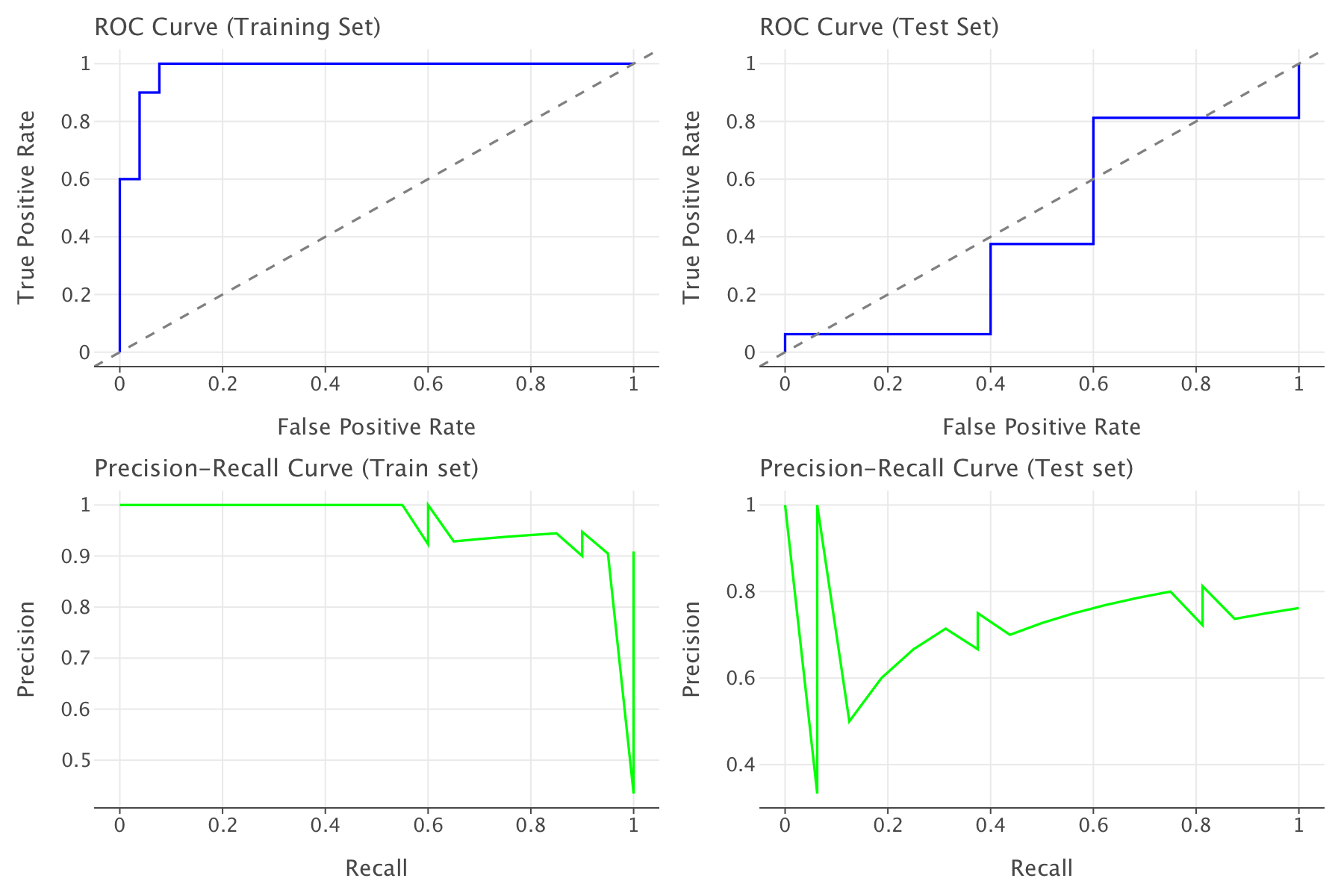 The precision on the test set is much lower (0.7) than on the training set (0.895). This indicates that the model is making more false positive predictions on the test set. Recall is also lower on the test set (0.4375), meaning the model is missing many of the actual positive cases. This precision-recall imbalance could mean that the model might need to be adjusted for better generalization to unseen data, especially to avoid overfitting and to improve performance on the test set.