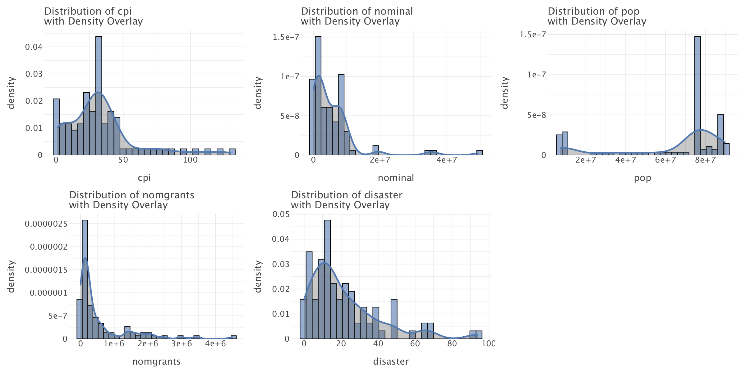 = ['cpi', 'totalwar', 'nominal', 'pop', 'nomgrants', 'disaster'] vars_to_plot