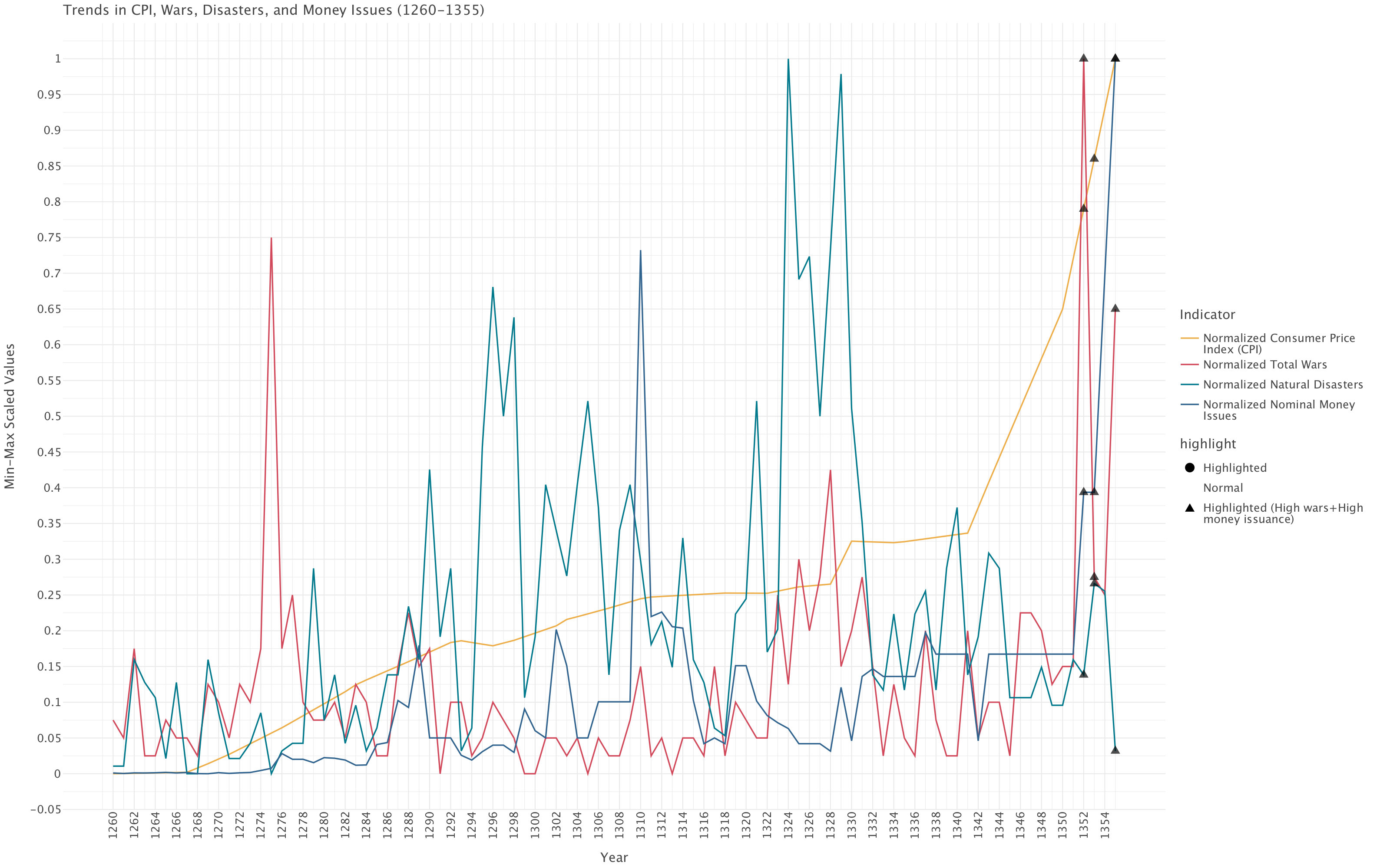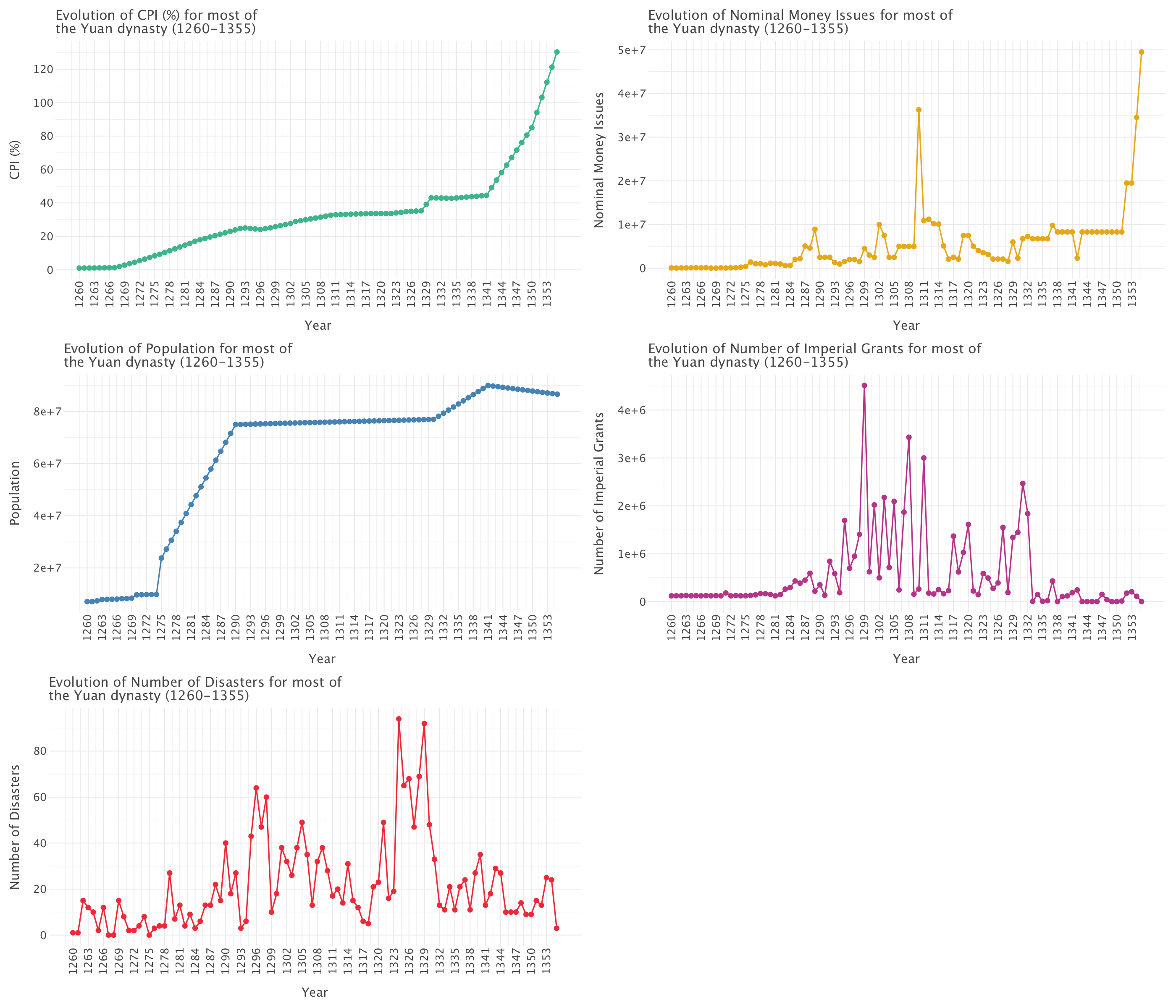 This graph allows to examine five critical indicators that track the rise and fall of the Yuan dynasty, revealing classic patterns of dynastic cycle in imperial China.