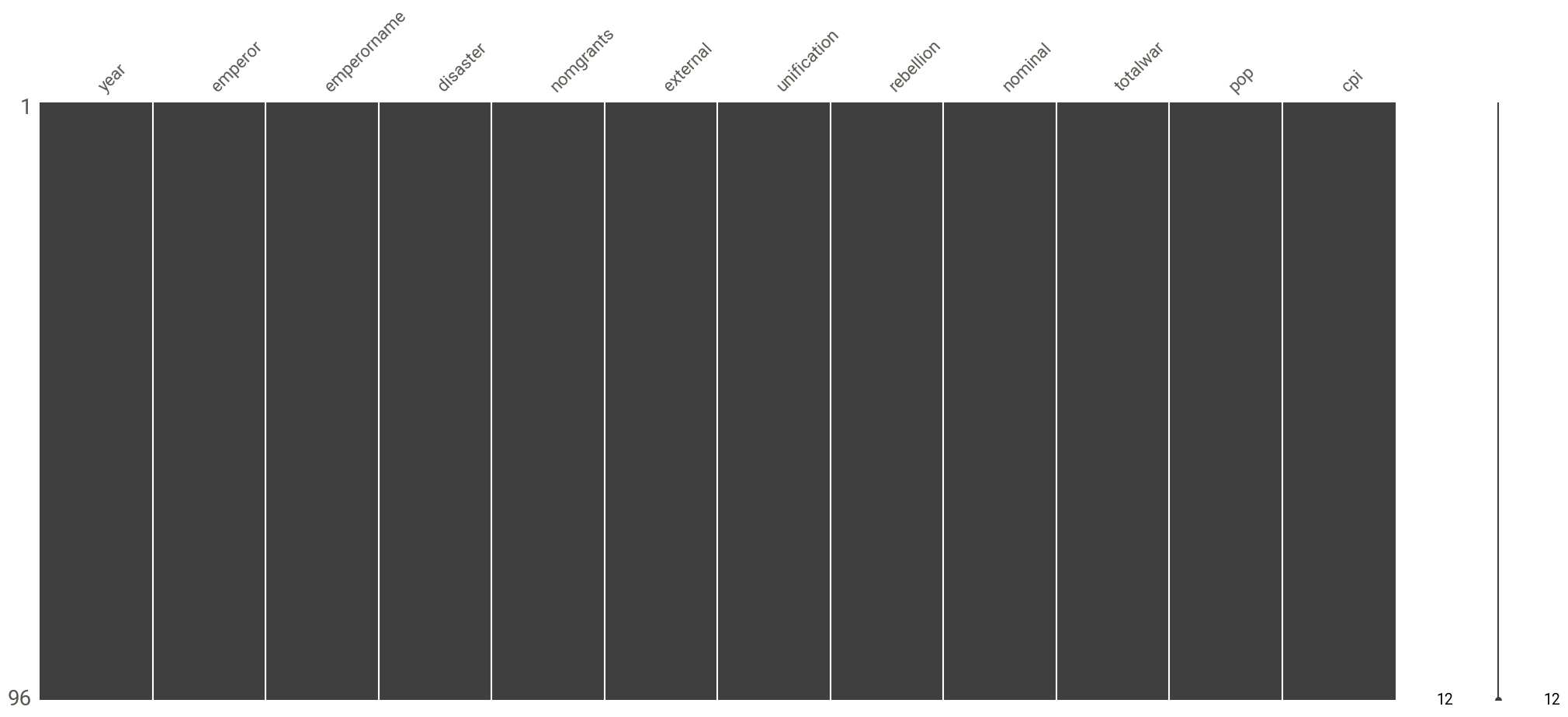 This dataset is clean and does not have any missing values. The scales of the variables vary widely (nominal money issues is in the millions for example). Some variables are skewed (e.g CPI, nominal money issues and total wars).We have a mix of numerical and categorical variables (emperorname