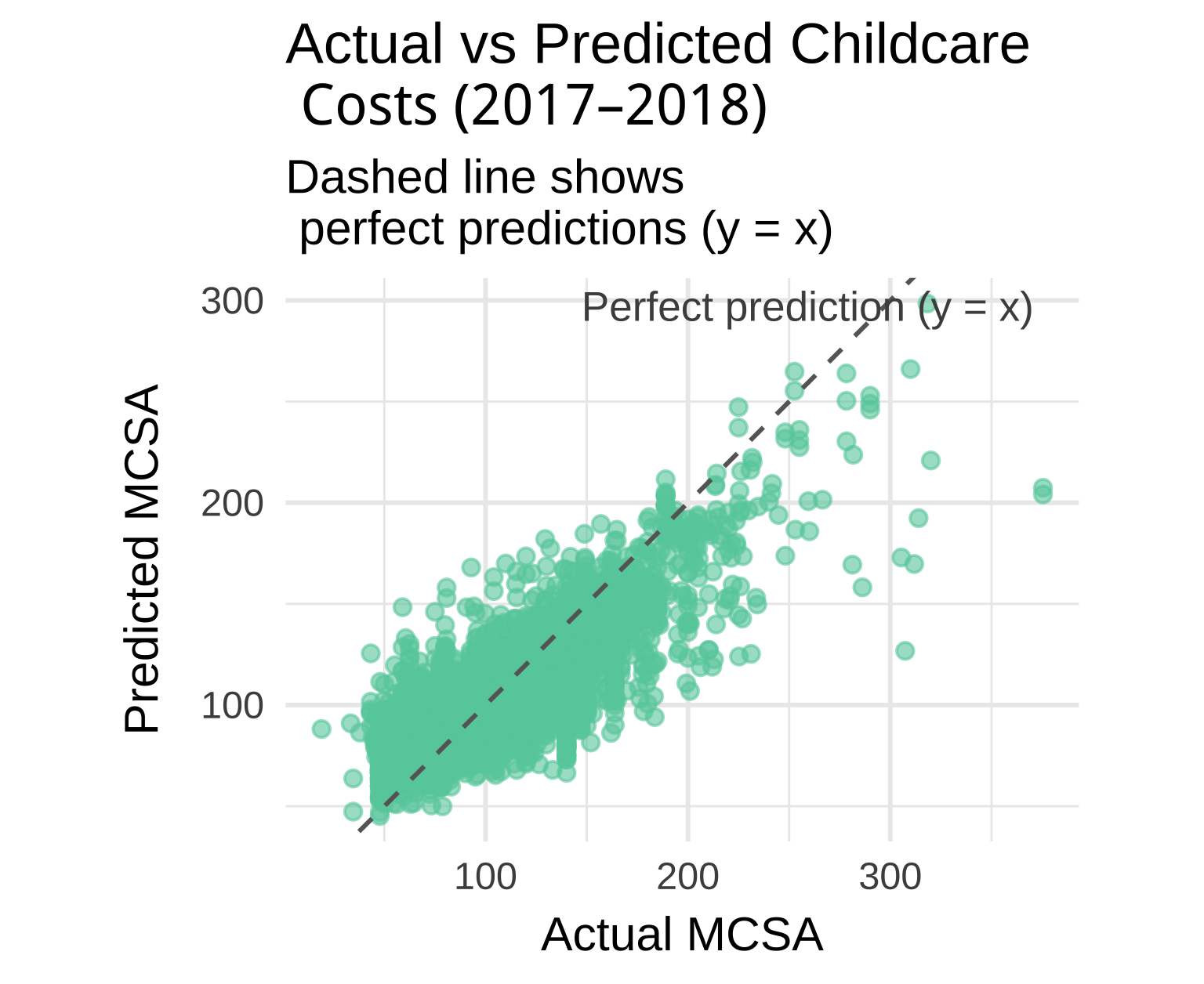 subtitle = "Dashed line shows \n perfect predictions (y = x)",
