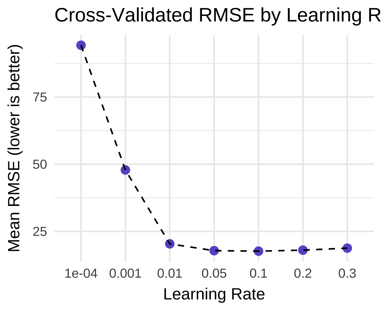The tuning curve shows a sharp drop in RMSE as the learning rate increases from 0.0001 to 0.01, then plateaus — confirming that 0.1 is in the “sweet spot.”
