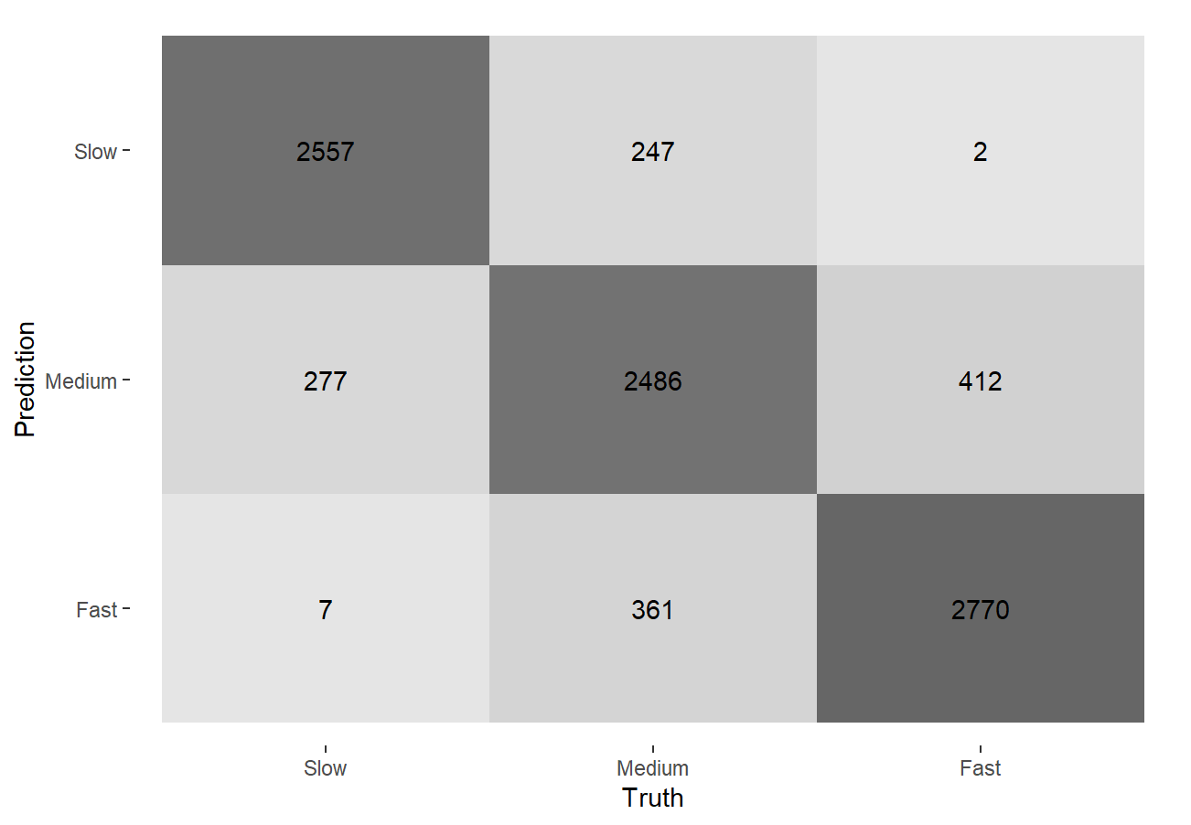 - Only 2 misclassified as “Fast” → extremely rare overestimation of speed.
