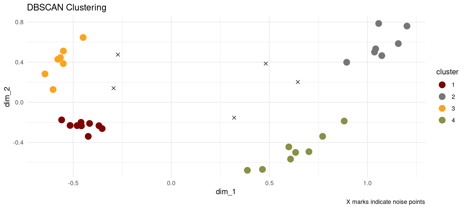 labs(title = "DBSCAN Clustering", caption = "X marks indicate noise points") +