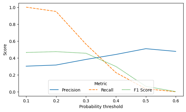 Let’s create a plot that shows performance over different thresholds, using colour to distinguish between the different evaluation metrics.