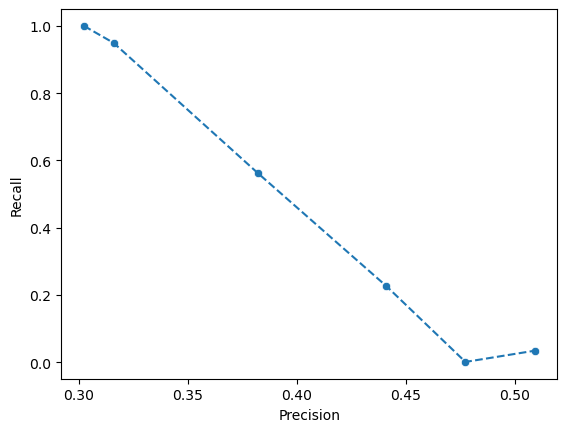 📝Task: Based on the precision and recall values you calculated, create a precision-recall plot to visualize the relationship between these two metrics. How does the shape of the precision-recall curve help you assess model performance ? What trade-offs do you observe between precision and recall ?