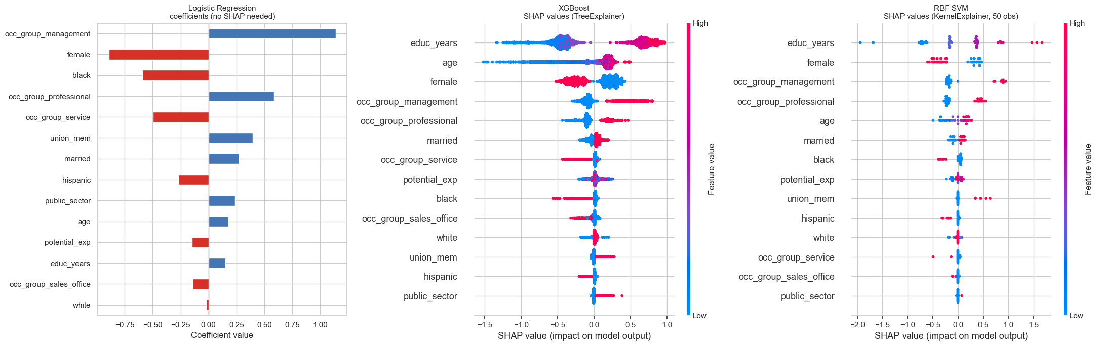 For logistic regression, what do the coefficients already tell you that SHAP would add? For the black-box models, what would you know about feature importance without SHAP? When two models agree on rankings, what does that increase your confidence in?
