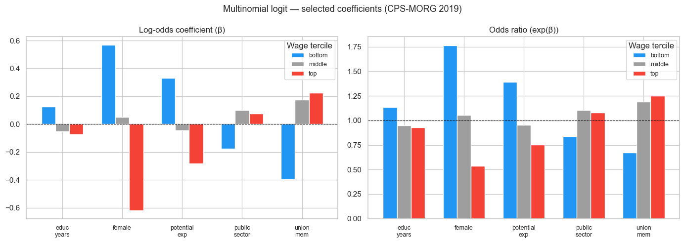 fig.suptitle('Multinomial logit — selected coefficients (CPS-MORG 2019)', fontsize=13)