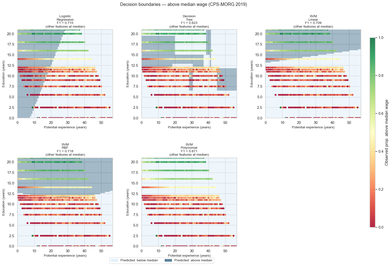 - Compare the decision boundaries produced by four models trained to predict whether a US worker earns above the median wage.