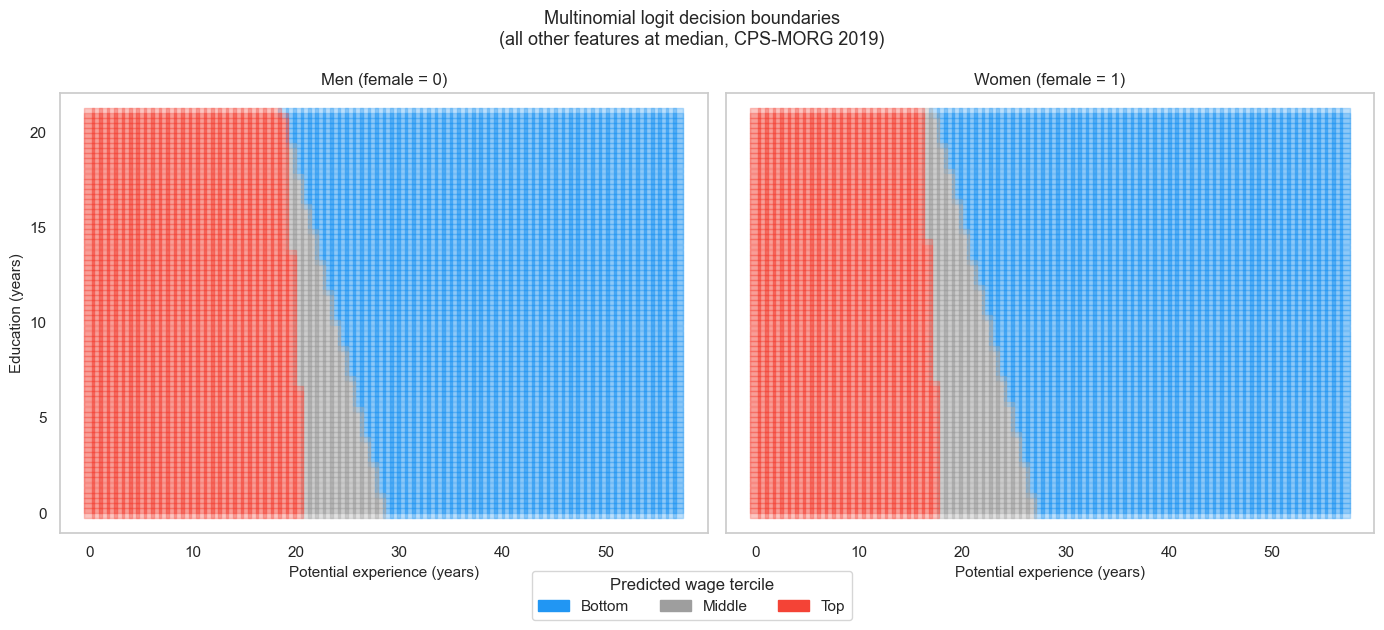 We now visualise how the predicted wage-tercile regions differ by gender.