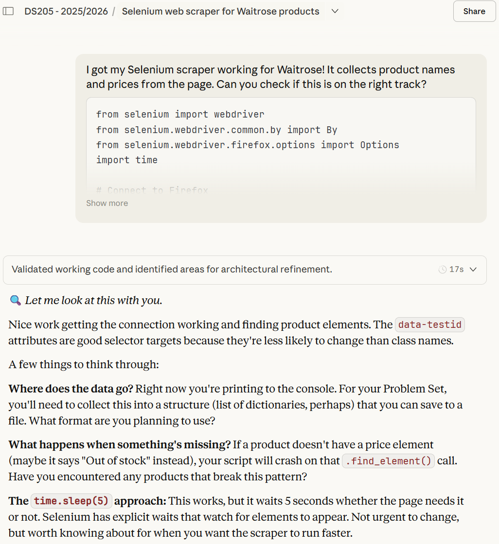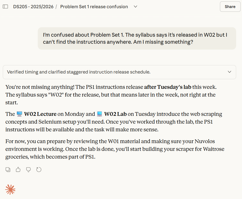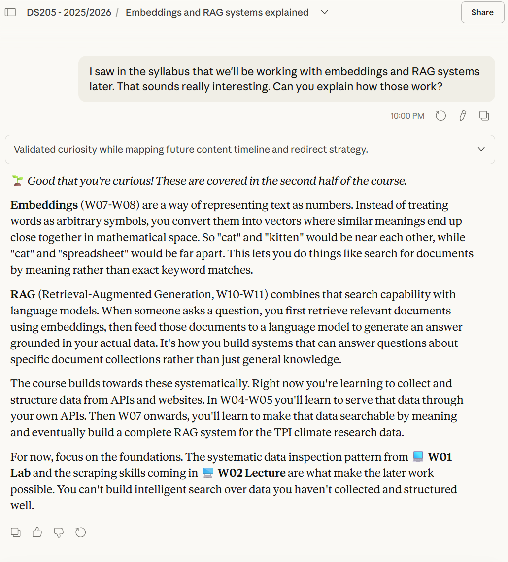 The DS205 Claude tutor knows our course. It understands the weekly structure, what you’ve covered so far, and what’s coming next. When you ask a question, it responds within the boundaries of where you actually are in the course.