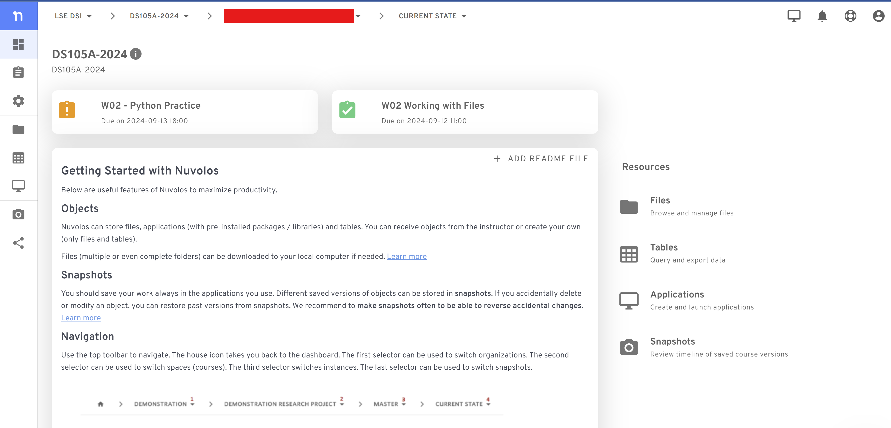 Figure 1. Your Nuvolos frontpage will have a ‘Space’ dedicated to this course. ⚠️ Warning: if the screenshot shows ‘DS105’ instead of ‘DS205’, it’s because I haven’t found the time to recreate the screenshot. Click on the ‘DS205-2025-2026’ word to access the Overview page.