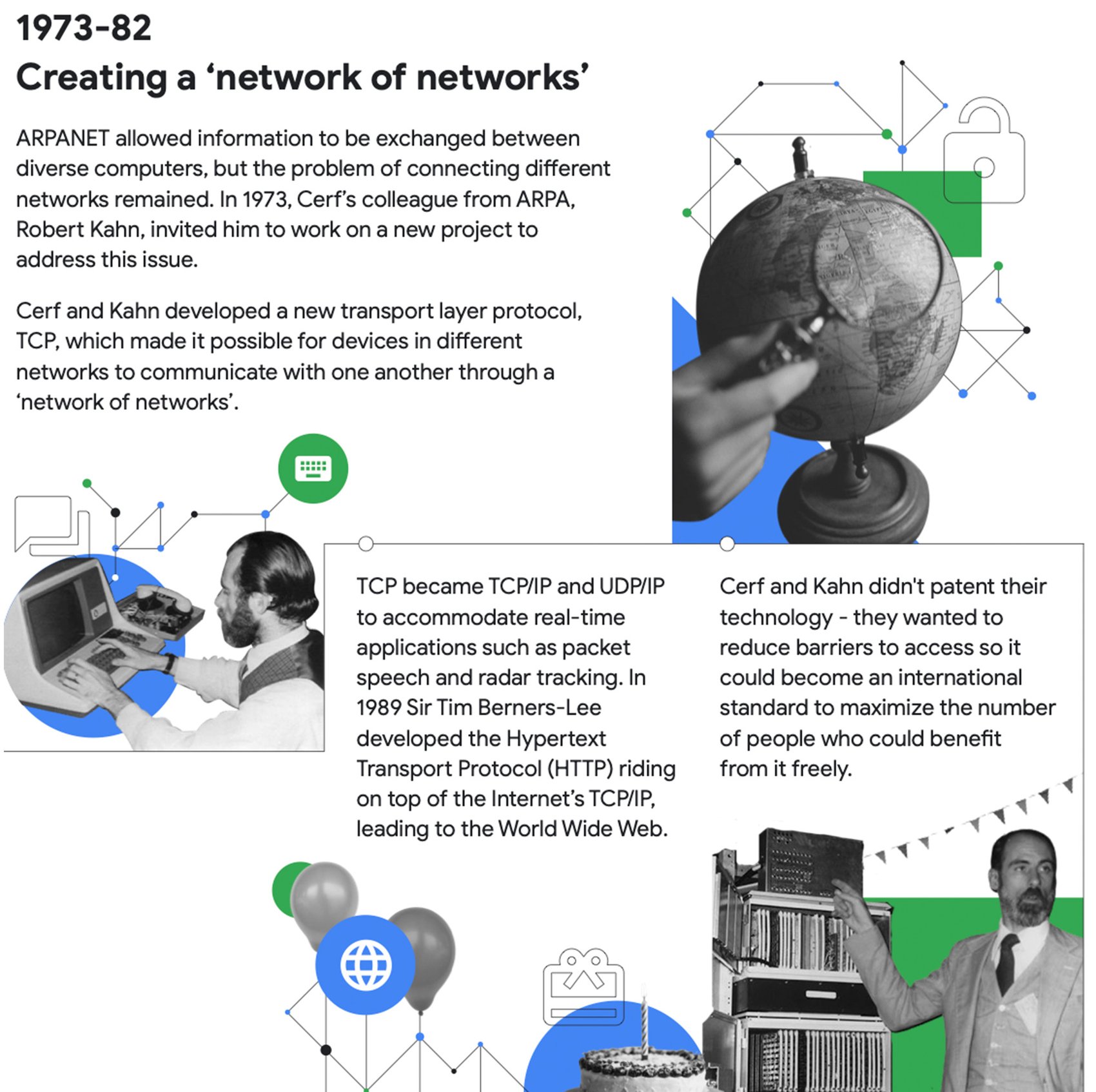 "An interconnected network of networks. Or, perhaps, an Internet. In the late 1960s and early 70s, that was the goal of the United States Department of Defense as it funded research and development of the early era of computers. The goal was to create a network of computers whose resources could be shared by researchers funded by the Defense Advanced Research Projects Agency. Later it was thought that such a system could work for command and control, helping to fight the Cold War and advance American interests across the globe."