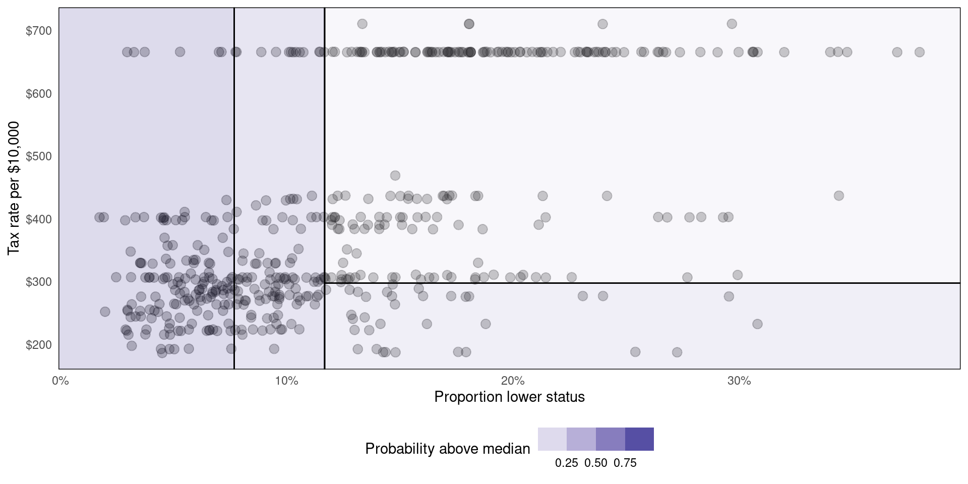labs(x = 'Proportion lower status', y = 'Tax rate per $10,000', fill = 'Probability above median')Recursive binary splitting