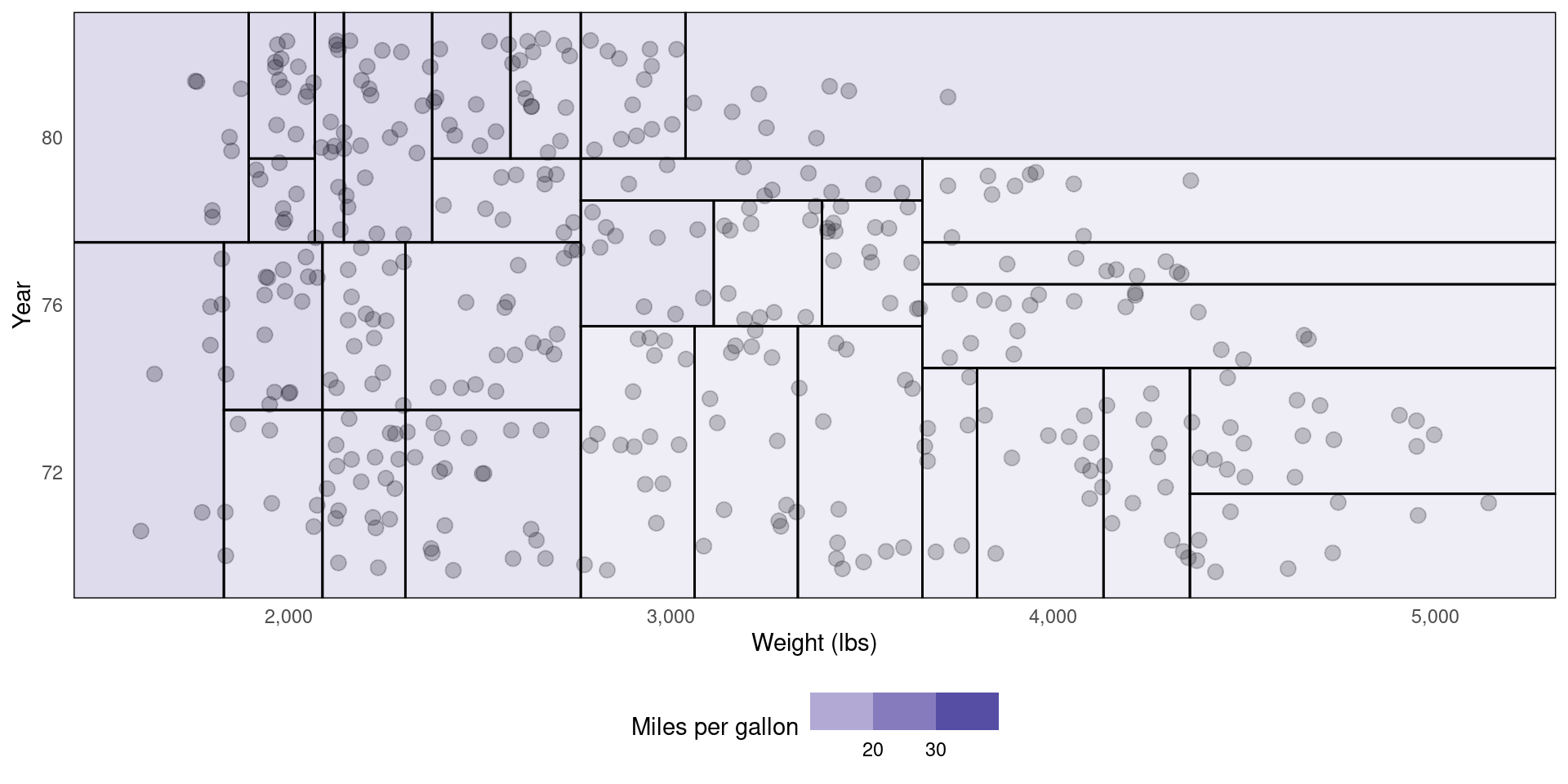 labs(x = 'Weight (lbs)', y = 'Year', fill = 'Miles per gallon')First, you will have to install the parttree package: